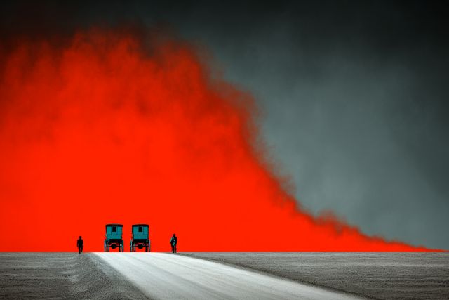 Amid the stark, surreal expanse of a desolate road, a scene of haunting beauty and mystic allure unfolds, evoking the striking ambience of the Burning Man festival. Three mysterious silhouettes – one on foot, two perched on a tandem bicycle – traverse an eerie landscape under a canopy of intense, crimson skies. This vivid artwork plunges viewers into an otherworldly environment, where the stark contrasts between the fiery heavens and the monochromatic earth create a visually striking tableau. As the road vanishes into the blazing horizon, it symbolizes the uncharted journeys of life and artistry, provoking thoughts about the destinations we quest and the paths we dare to travel. The dual chairs, abandoned on the desolate track, add an element of whimsical mystery, suggesting a narrative paused, or perhaps abandoned, in the midst of a fiery saga. The enveloping red mist not only enhances the visual drama but also metaphorically represents the burning passion and unyielding drive associated with artistic and personal exploration. This piece aligns with the adventurous spirit of those who seek meaning beyond the visible, inviting interpretations as limitless as the horizon itself.