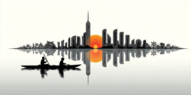 Bathed in the gentle hues of a setting sun, the Miami skyline emerges as a masterpiece of reflection and detail on this exquisite canvas. The horizon bends subtly, mirroring delicate architectural silhouettes against a smooth, glass-like water surface. Amidst towering skyscrapers, the iconic spire of the Freedom Tower pierces the sky, casting a slender shadow over the serene waters. Below, the silhouette of two kayakers glides effortlessly, their paddles barely touching the water, disrupting the mirrored world with ripples that dance away into the sunset. On the edges, tiny blooms dot the landscape, their intricate details suggesting a fusion of urbanity with the natural world. A vibrant sun, a fierce orb of orange and yellow, sits at the heart of the skyline, infusing the scene with warmth and a promise of renewal. This panoramic view offers not just a depiction of Miami but an intimate experience of its quiet, majestic evenings where the hustle of the city whispers to the rhythmic pulse of the sea.