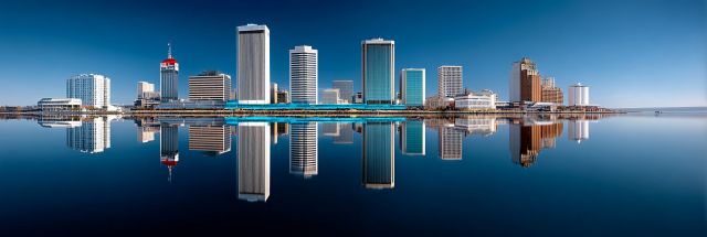 As the horizon stretches wide under a sky painted in the deep blues of the Fourth of July, the Memphis skyline emerges in a mesmerizing display of golden light. The city's architectural landmarks, dressed in the rich, glowing hues of sunset, reflect elegantly upon the calm waters before them creating a near-perfect symmetry that invites viewers into a serene, almost surrealist dreamscape. Each building, from sleek modern towers to historic edifices, casts its own tale in this panoramic portraiture, their stories interwoven by the fading daylight.
