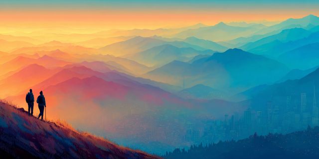 Twilight Embrace: Hikers Overlooking San Francisco's Sunset Skyline