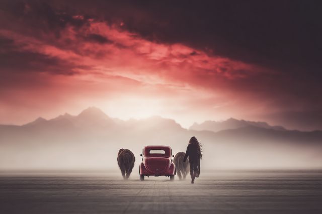 Amidst a dreamlike panorama where the earth meets an incandescent sky, a scene unfolds that transcends the ordinary. A vintage, fiery red automobile, reminiscent of the spirited 1930s, makes its way across an ethereal plane, flanked by two noble horses, symbols of wild beauty and untamed freedom. This surreal tableau is bathed in a celestial glow that paints the heavens in shades of deep crimson and lavender, suggesting the quietude of dusk or the stillness of dawn. Dust swirls around hooves and wheels, blurring lines between reality and fantasy. To witness this vista is to be drawn into a narrative that whispers of old-world charm and the relentless pursuit of adventure. Each element in the scene—from the precise engineering of the classic car to the graceful strength of the equestrian companions—has been rendered with utmost care, inviting viewers to linger over details, to imagine the stories embedded in this silent journey. The distant mountains stand as silent sentinels, their outlines softened in the haze, marking the boundary of the known world and the vast, uncharted beyond. This artwork not only captures a moment in time but also evokes a sense of ongoing movement, of stories yet to unfold.