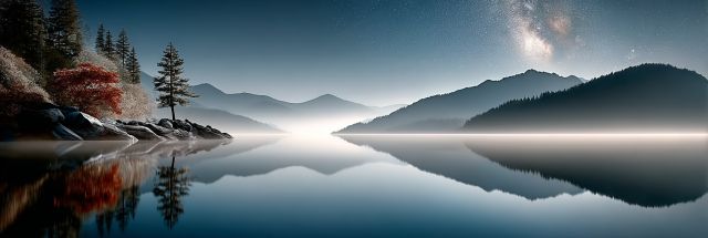 As dusk folds into the velvety depths of night, a serene mountain lake becomes the mirror of the cosmos, capturing a breathtaking canvas where the Milky Way dusts the heavens with its silvery glow. Nestled amid a calm range of mountains, the lake lies undisturbed, a perfect glass reflecting the myriad of stars sprinkled across the night sky. Along its shores, a sparse collection of pine trees and rugged boulders are silhouetted against the moonlit sky, adding a mystical quality to this tranquil landscape. The distant hills roll gently under the celestial theatre, bathed in the soft lunar silver that lights up the edges of the night. This scene, drenched in deep blue tones, combines the majesty of the night sky with the grounding presence of the earthly terrain, creating a dreamy yet inspirational atmosphere. Each element, from the whispering pines to the reflective lake, is imbued with an ultrarealistic quality that elevates its cinematic appeal. The overall composition transcends simple landscape art, inviting viewers to pause and immerse themselves in the pure, untouched beauty of nature at night. Beyond just visual artistry, this piece is a reminder of the tranquil solitude and awe-inspiring beauty of our planet's natural landscapes, a precious moment forever captured in time where one can almost hear the soft lull of the night wind and the silent dialogue between the earth and stars.
