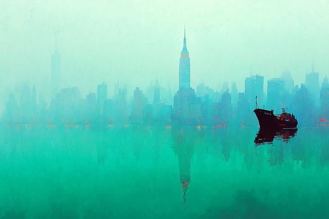 Enwrapped in a dream-like veil of jade green, the iconic silhouette of New York City’s skyline emerges from a misty abyss, captivating and ethereal. This art print reinvents the classic urban landscape through an abstract lens, where colors blend and lines soften, suggesting a city that floats on the brink of imagination. The sharp spire of the Empire State Building punctuates the foggy horizon, a steadfast sentinel amid the swirling sea of color. Boats, mere shadows beneath the towering structures, glide silently on the water's mirror-like surface, their forms echoed subtly in the tranquil depths. Beyond the serene foreground, the city fades into a gradient of greens and blues, a canvas where the waking world meets the whimsical. This piece offers not just a view, but a voyage into a serene, yet surreal realm where the hectic pace of city life melts away into the quietude of an almost forgotten dream. It invites viewers to pause and reflect, to lose themselves in the depths of its layered hues, and to rediscover the metropolis as a place of mysterious beauty and endless possibility.