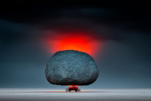 In a vast expanse of shadowy blues and grays, a mammoth, round boulder defies gravity, precariously perched atop a tiny red carriage. The stark contrast between the immense weight of the stone and the fragile structure that supports it creates a tension that is both unsettling and captivating. Below, the barren landscape extends endlessly, a flat horizon barely disturbed beneath the oppressive weight of the rock. Above, the sky erupts in a conflagration of fiery orange and red hues, evoking the last, defiant blaze of sunset against impending darkness. This artwork not only captures a moment of surreal balance but also evokes a range of emotions from awe to curiosity, leaving viewers pondering the delicate interactions between elements so wildly disparate in scale and nature. The eerie calm of the scene, punctuated by the intense burst of color above, mirrors the often unseen forces that balance and shape our own world. As much as it is a visual spectacle, the piece is a metaphor for resilience, a silent ode to the enduring strength required to support overwhelming burdens against all odds.