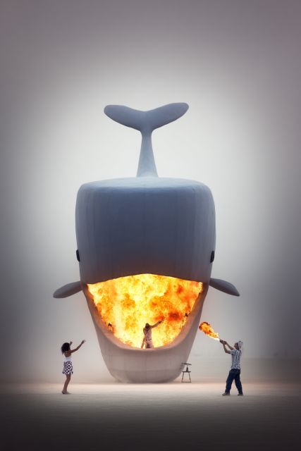 As twilight descends upon an ethereal horizon, a monumental whale sculpture stands as a sentinel against the creeping fog, its silhouette stark against the soft, muted background. The sculpture’s smooth, imposing form contrasts dramatically with the vivid inferno raging within its belly—a captivating spectacle of orange and yellow flames that swirl and dance with mesmerizing intensity. This striking visual metaphor captures a complex interplay of beauty and destruction, symbolizing the deep inner tumults and fiery passions that often reside beneath a calm exterior. The scene is further animated by the small, silhouetted figures that interact with the fiery tableau: a child reaches out in awe, an adult stands by a ladder, feeding the blaze, and a torchbearer engages directly with the flame. This tableau encourages viewers to reflect on their own internal fires—the dreams, fears, and undying sparks of hope that fuel their daily lives. The powerful imagery not only highlights human interaction with art and nature but also invokes a sense of wonder and introspection, making the viewer ponder the monumental scale of our inner emotions compared to the physical world around us.