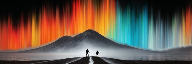 An otherworldly canvas unfurls, as the Northern Lights weave a tapestry of vivid hues against the nocturnal backdrop. Two solitary figures, presumably hikers, stand dwarfed by the grand spectacle, their silhouettes etched sharply against a glowing sky. The image captures a moment where these ethereal sky flames of green, red, orange, and blue not only adorn the heavens but reflect their myriad colors onto the tranquil water, echoing nature's immense canvas. The contrast between the soft mist at ground level and the sharp, powerful streaks of light creates an almost surreal scene, inviting viewers to pause and contemplate the vastness of our natural world.