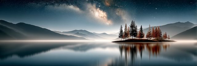 In the serene embrace of the night, where the cosmos drapes its star-studded cloak across the sky, a tranquil mountain lake mirrors the celestial saga unfolding above. The lake, a flawless mirror, captures every constellation, turning the water into a floating sky brimming with the galaxy’s splendor. The Milky Way, a smoky trail of starlight, arches majestically over a cluster of silent pine trees, their outlines etched sharply against the night's canvas.