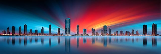 As the sun bids farewell, the Miami skyline transforms into a breathtaking spectacle, its architectural achievements silhouetted against an explosion of fiery reds and tranquil blues. Skyscrapers reach ambitiously towards the sky, mirrored perfectly in the still waters below, creating an almost surreal island city floating between two infinite realms. This artwork captures the vibrancy and dynamic energy of Miami, pulsating with life yet tranquil in its waterscape reflection. The sky, painted with broad strokes of deep crimsons and vibrant oranges, fades to gentle blues and soft purples, encapsulating the transition from day to night in a dance of colors. The reflective surface of the water adds a layer of depth and perspective, doubling the city’s grandeur with its glass-like texture. Each building, lit from within, suggests the ceaseless energy and eclectic culture thriving behind its windows. This piece not only depicts a city but also tells the story of Miami’s dual personality—both a bustling urban hub and a serene waterside community. It is a canvas that invites the viewer to explore the harmonious contrasts and the peaceful interlude at twilight.