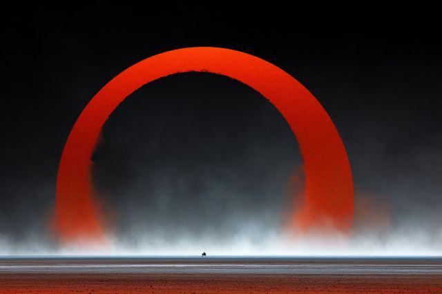 Envision a canvas where nature’s grandeur meets human imagination, casting a spellbinding fusion of wonder and abstraction. This artwork immerses viewers into an ethereal desert landscape under the ghostly dominance of an oversized, flaming red orb, evoking the mystique of the Richat Structure amidst the vast solitude of the Sahara Desert. The burning ember of the sky casts a surreal glow, enveloping the solitary figure in a scene that bridges the natural with the supernatural. This distinct manifestation of art pulls observers into a dialogue with Earth's ancient geographies and the vast untold stories encapsulated within them. Each textured brushstroke and color gradient magnifies the feelings of isolation and intrigue, making this piece a powerful statement for existential reflection and aesthetic appreciation. The artwork invites one to ponder the delicate balance between our perception of the known world and the otherworldly realms that art can explore. It's not just a visual journey; it is a profound meditation on our place within the wider universe, wrapped in the riddle of an optical illusion inspired by the iconic Burning Man festival aesthetics.