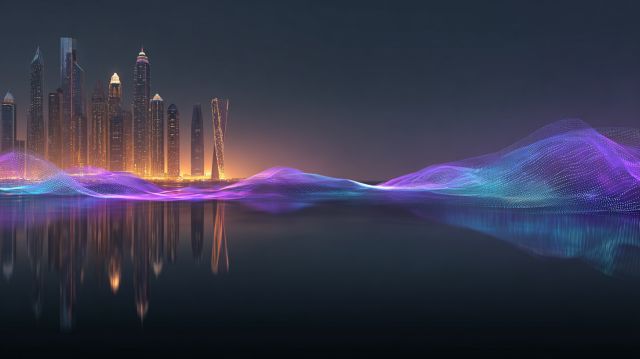 Vibrant LA Skyline: Futuristic Waves of Neon Over Water