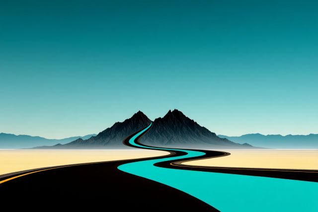 Immerse yourself in an enthralling visual journey where a sensuous S-curve sweeps elegantly through a desert scape, punctuated by the sharp, imposing forms of twin peaks afar. This artwork masterfully combines the ethereal beauty of turquoise inlays that mark the path, contrasting dramatically against the surrounding golden expanse that stretches into a delicate mist. As your eyes follow the flow of the road, it feels almost as if the ground beneath is in fluid motion, guiding you towards the distant mountains which rise like ancient titans, guardians of the path ahead. Each element in the scene, from the crisp shadows that cradle the road to the soft glows that bathe the peaks in warmth, works in harmony to construct a dreamlike vista that whispers tales of adventure and solitude.