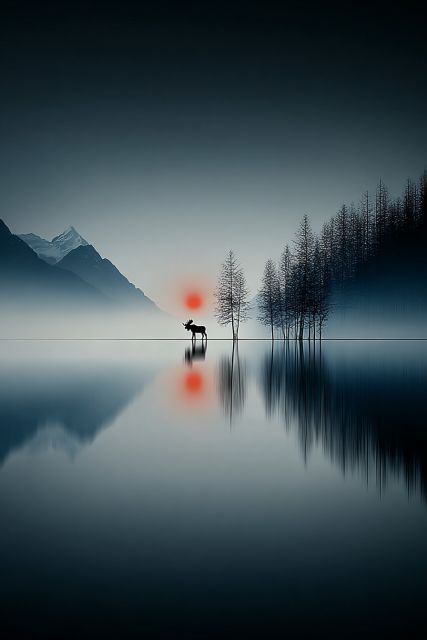 Serene Twilight: Moose Silhouette Against Mountain Lake Scene