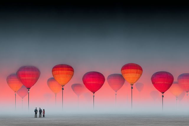 As dusk descends, an otherworldly scene unfolds—a mysterious expanse where ethereal fog embraces the earth and the horizon stretches into infinity. Here, massive, iridescent balloons rise in a symmetrical procession, glowing with luminosity against the twilight's soft embrace. These colossal orbs, bathed in hues of deep red and fiery orange, hint at the untamed spirit of adventure and the joy of discovery. Below, figures stand, perhaps friends or explorers, dwarfed yet dignified amidst the grand scale of their surroundings. This artwork, reminiscent of surreal dreams or distant memories, invites the viewer to pause and wander into its depths, pondering the narratives that might unfold in such a fantastical setting. It is a canvas that captures the heart of imagination, where every element conspires to draw one into a tranquil yet exhilarating reverie. As the cool blues of the fog clash with the warmth of the balloons, a dance of colors and emotions swirls, suggesting that within this quietude there lies a vibrant life-force, a celebration of the whimsical and the unknown.