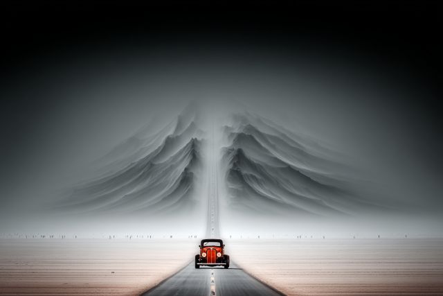Imagine embarking on a journey where the horizon stretches into the unknown, and reality blurs with the fantastical. Here, an old-fashioned car rolls down a stark, symmetrical road that slices through an expansive flat landscape. Above, towering pillars of mist rise like colossal curtains, folding into the heavens in a mesmerizing mirror image. This artistic photograph captures a scene that intertwines mystery with a dash of nostalgia. The ethereal atmosphere, tinged in monochrome tones, resonates a quiet eternal moment, standing in stark contrast to the vibrant, warmly lit rear lights of the vintage automobile. An aura of solitude and reflection envelops the viewer, inviting one to ponder the roads we choose and the journeys we undertake. This artwork masterfully combines elements of isolation and adventure, portraying a surreal narrative journey that would capture the imagination of any observer.