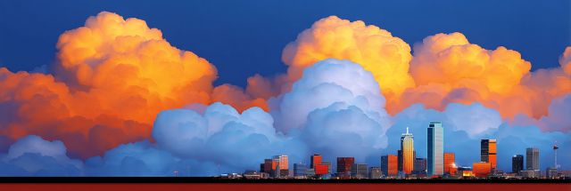 Bathed in the fiery hues of a setting sun, the Oklahoma skyline emerges as a stunning witness to the Fourth of July festivities, casting a silhouette that contrasts dramatically against an expansive azure sky crowded with majestic, golden clouds. The visual panorama stretches wide, capturing the spirit of freedom and celebration that marks this significant day. Each building glistens, reflecting the sun’s last golden rays, as the sky transforms into a canvas of vibrant oranges and deep blues, mirroring the lively energy of a city celebrating its liberty and achievements.