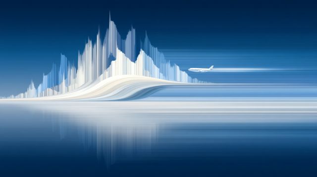 As the world rushes beneath, a lone aircraft glides smoothly through a surreal skyscape, leaving the subtle trace of a city skyline in its wake. This artwork captures the essence of tranquility and movement interwoven with a sense of urban insignia. The piece, characterized by its minimalistic, vector-inspired aesthetic, plays with the contrast of fluid lines against sharp, geometric silhouettes of iconic buildings seemingly sculpted from the clouds. The hues of blue, ranging from the deep azure of the sky to the softer tones mirroring the calm ocean, create a refreshing monochrome palette that draws the viewer into a state of calmness. The gradation of color and elements gives the impression that the city itself is an organic outgrowth of the clouds, each skyscraper flowing into the next.