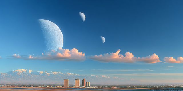 Beneath an expansive blue sky that embraces the mystical allure of two oversized moons, the skyline of Santa Ana stands resplendent, caught in the golden hues of Fourth of July celebrations. As the golden glow casts a soft light over the city’s modest yet proud high rises, the scene forges a connection between the familiar and the fantastic. This visual portrayal merges terrestrial architecture with celestial phenomenons, crafting a surrealistic tableau that tempts the observer's imagination and beckons a closer look. Each building basks symmetrically aligned, reflecting the somewhat ethereal light, illuminating every edge and surface with crisp, high-definition clarity. The vibrant portrayal is not only a testament to creative photography but an indulgence into a scene that transcends the everyday into the realm of the extraordinary. Here, against the canvas of nature’s boundless backdrop, reality and creativity interlace to narrate a story of a city, celebrated not just by its people but by the cosmos itself. It is a moment forever suspended in time, offering a peaceful yet powerful ode to urban pride and universal wonder.