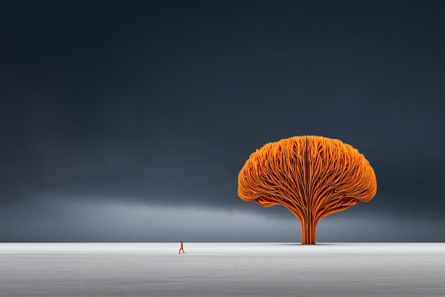Amid a vast and ethereal landscape, the stark contrast of a vivid orange tree bursts forth, capturing the gaze and imagination of all who behold it. This image transports viewers to a surreal plane where the simplicity of color and form collides with profound depth. A lone figure, minuscule in stature yet potent in presence, stands beneath the sprawling canopy of this luminescent tree, draped in the fiery hues reminiscent of a sunset locked in eternal embrace with the dawn. The horizon stretches endlessly, wrapped in a cloak of grey that whispers of impending storm or a clearing squall. Here, the solitary tree becomes a beacon of resilience and strength, its intricate branches woven tightly like the threads of life's rich tapestry. As the ominous skies loom above, the scene becomes a theater of light and shadow, a visual symphony that speaks to the wondrous complexities of existence and the solitary journeys we embark upon. This striking composition not only showcases the artistry of blending fantastical elements with stark, compelling landscapes but also evokes a sense of introspection and wonder, urging one to pause and reflect on the larger spectacle of life.