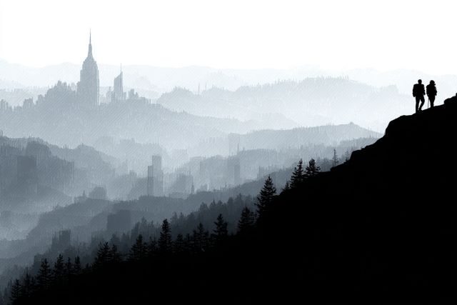 As dawn breaks, the world transforms into a canvas of muted grays and soft shadows, perfectly encapsulating a serene moment above the bustling city of New York. This art print masterfully captures a pair of hikers poised on a rugged mountain's edge, the vastness of the urban jungle spread beneath them. It is a scene of contrast and harmony, where nature meets civilization. The iconic spires of New York's skyscrapers pierce the foggy backdrop, suggesting the city’s sleepless energy without overpowering the calming presence of the natural foreground. This juxtaposition not only offers a fresh perspective on the cityscape but also evokes a sense of adventure and reflection. The minimalist approach emphasizes clean lines and geometric simplicity, making it a subtle yet powerful piece that invites viewers to pause and reflect on the interplay between human endeavor and natural beauty.