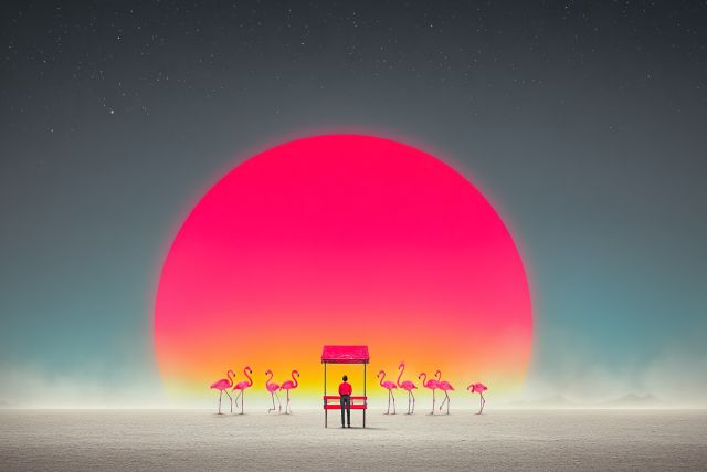 Beneath a monolithic, luminous red sun sinking into an endless horizon, a solitary figure seated at a bench finds himself embraced by an ethereal and calm vastness. He is a solitary beacon of humanity, dwarfed yet unswayed, amidst a congregation of neon pink flamingos that stand elegantly on one leg, casting long, slender shadows across the flat expanse. The scene is set against a crisp blue skyline that gently fades into the stark whiteness of the ground, creating a striking contrast that is both otherworldly and serene. This artwork, rich in symbolism and surrealism, evokes a deep sense of reflection about our place in the universe. The glaring sun, with its exaggerated enormity and intense hue, serves as a backdrop that both illuminates and overwhelms, suggesting themes of infinity and the sublime. As the viewer's eyes wander, they might find themselves contemplating the relationships between isolation, community, and the natural environment, inspired by the visual juxtaposition of a single human figure amidst the graceful flock. This imagery, while simple in composition, pulls deeply on the strings of curiosity and introspection, making it an unparalleled addition to any collection.
