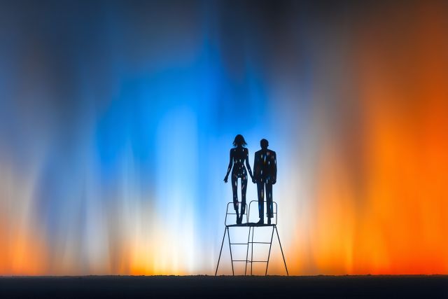 Under a dramatic sky painted with hues of sinking orange and deepening blue, two striking silhouettes stand poised on a pedestal, embodying a visual ode to companionship and surrealism. The figures, defined by a smooth, statuesque finish that mimics the introspective serenity of human nature, gaze into the vastness of a twilight-drenched landscape. This artwork transports viewers to a realm where reality blends with dreams, inspired by the creative spirit of the Burning Man festival. The silhouettes, with their sleek, modern forms, evoke a sense of anticipation and mutual understanding, standing together yet facing a world expansive and unknown. As shadows lengthen and the sky melts from fiery orange to the coolness of twilight, the artwork invites contemplation of unity in the face of infinite possibilities. The vivid backdrop, with its interplay of light and color, adds a dramatic flair to the composition, celebrating the power of art to evoke emotion and provoke thought. This canvas is not just a depiction but a journey—a visual narrative that guides the observer through dimensions of introspective explorations and collective existential ponderings.