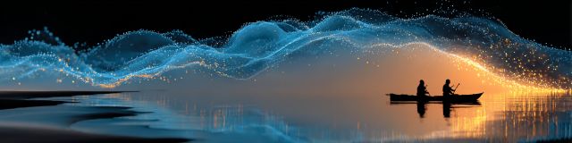 Under the canopy of an ink-black night, two kayakers glide effortlessly through a serene lake, surrounded by vibrant ribbons of teal and aqua light. These luminous arcs mirror a dance of stars above, harmony reflected both in the heavens and across the water's gentle swell. This captivating scene inspires a feeling of deep tranquility interspersed with the thrill of exploring the unknown. Each paddle stroke ripples through the glowing waters, crafting patterns that ebb and flow like the tide of the cosmos. Far from the hum of city life, this snapshot offers viewers a glimpse into a night where nature unveils its most mystical side. The kayakers, silhouetted against the shimmering tableau, move quietly, almost reverently, through this magical expanse, their journey a meditative interaction with the elements. As the cool night air brushes against them, the peace of the environment seeps into their bones, crafting a moment of perfect unity with the universe. This artwork not only captures a beautiful adventure but also evokes a sense of the sublime, inviting contemplation on the vastness of our world and the beauty of night when it dresses in its glorious, bioluminescent attire.