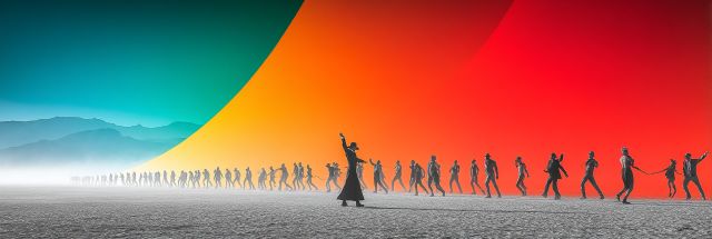 In an enthralling display of unity and vibrance, a diverse procession of individuals dances across an ethereal landscape. The dusky horizon fades into soft hills, enveloped by a kaleidoscopic sky that transitions from a cool, soothing teal to a fiery, passionate orange. Each dancer, connected by hands in a line that stretches infinitely into an otherworldly desert plain, moves rhythmically, their silhouettes casting an enigma against the stark terrain. At the forefront, a lone figure raises her arms almost in invocation of the elements, her flowing dress rippling like the very spirits of the air caught in perpetual motion.