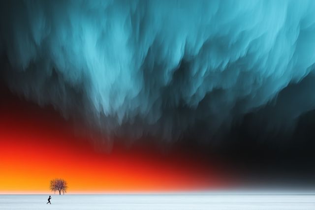 Envision a horizon where the ordinary meets the extraordinary in a vivid tableau of evolving contrasts. This masterful canvas manifests a dream-like scenario under the engulfing embrace of an immense storm. The surreal sky, painted with robust shades of turquoise and deep blues, billows like a turbulent sea overhead, threatening yet mesmerizing. Below, the calm horizon bleeds into a fiery strip of crimson and orange, illuminating the sparse landscape with a warmth that dances on the edge of foreboding. A lone figure, diminutive yet resolute, traverses this stark expanse, their solitary silhouette casting a long shadow towards a sole tree, barely discernible against the illuminated horizon line. This poignant interplay between the storm's formidable power and the tranquil, yet stark landscape, invites viewers into a narrative ripe with themes of resilience, solitude, and the awe-inspiring power of nature. Each element—the turbulent sky, the fiery horizon, the lone wanderer—contributes to a scene that is as introspective as it is striking, suggesting a moment suspended between calm and chaos.