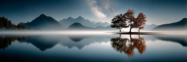 Beneath the celestial ballet of twinkling stars and the majestic swath of the Milky Way, a tranquil scene unfolds on a mountain lake, where nature's mirror doubles its beauty. The night sky, embroidered with starry specks, arches over a serene lake, casting a reflection so perfect, it seems the cosmos has touched the earth. Nestled in the embrace of distant mountains, the silhouette of a forest whispers tales of the wild unknown, while two ethereal trees on a tiny isle stand as silent sentinels, witnessing the eternal dance of sky and water. The mist, ghostly and lingering, adds a layer of mystery, softening the boundaries between the real and the surreal. Adding to the dreamscape are two small kayakers, dwarfed by the vast expanse, paddling gently and blending into the night's magic. This image captures not just a place, but a moment of profound peace and introspection, where every ripple on the water and leaf in the breeze is a verse in nature's poem.