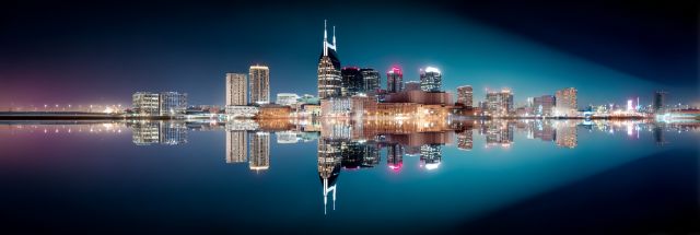 As dusk settles over Nashville, the city's skyline emerges as a breathtaking canvas of glowing lights and sharp contrasts, mirrored perfectly in the calm waters beneath. This photograph, captured during the serene moments of the Fourth of July, transcends mere documentation of a cityscape. Instead, it invites the viewer on a visually arresting journey across Nashville’s iconic buildings and structures, each alight with the hopeful radiance of celebration. The AT&T Building, colloquially known as 'The Batman Building', stands prominently, its distinctive spires piercing the twilight sky. Surrounding it, myriad lights twinkle like stars descended upon the earth, their reflections in the river below doubling their intensity and beauty, creating a symmetrical dance of color and brilliance. Each light tells a story—of freedom, of festivity, and of a city rich in musical heritage and cultural vibrancy. The cool blue hues of the sky contrast magnificently with the warm golden glow of the city lights, crafting a palette that is both invigorating and soothing. This composition not only captures the physical beauty of Nashville at a moment of national pride but also encapsulates the spirit of festivity, resilience, and unity that the Fourth of July represents. This masterpiece of photography showcases not just a city, but a moment frozen in time, vibrant yet tranquil, dynamic yet intimate.