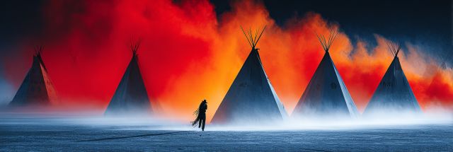 Under the swirling hues of a twilight sky, a scene unfolds that is as breathtaking as it is mystic. The horizon blazes with an intense, fiery glow, setting the backdrop for a silhouette of traditional teepees sharply outlined against the fierce orange and red. This canvas seems to pulsate with the rhythm of ancient drums, as a lone figure wrapped in traditional garb strides purposefully across an icy foreground shrouded in mist. The contrast between the striking warmth of the fire and the chilling blues of the frost encapsulates a perfect balance, echoing the eternal dance between day and night, warmth and cold, tradition and the ever-moving forward flow of time. This picturesque tableau not only paints a visual story of a culture deeply rooted in heritage and ritual but also evokes a profound sensation of awe and wonder, as it invites the onlooker to step into a world that bridges the real and the surreal. The ethereal quality of the composition, combined with the stark geometries of the teepees and the enigmatic presence of the wandering figure, transforms this artwork into a vibrant dialogue between the ancient past and contemporary artistry.