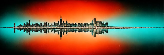 As twilight embraces the horizon, the Chicago skyline emerges with a captivating glow, reminiscent of the surreal and spirited atmosphere of Burning Man. This artistic representation melds the architectural magnificence of Chicago with an abstract color palette, infusing the cityscape with fiery oranges and cool turquoise blues, reflecting off the serene water below. The mirroring effect not only doubles the visual impact but also invites viewers into a realm that straddles reality and fantasy. Each building, from the iconic Willis Tower to the sweeping curves of the Lake Shore Drive, is depicted with meticulous detail, yet bathed in an ethereal light that suggests not just a city, but a canvas of human energy, creativity, and endless possibilities. This piece offers more than just a visual experience; it’s an emotional journey through the heart of one of America’s most beloved cities, reimagined through the lens of one of the most unique cultural festivals in the world.