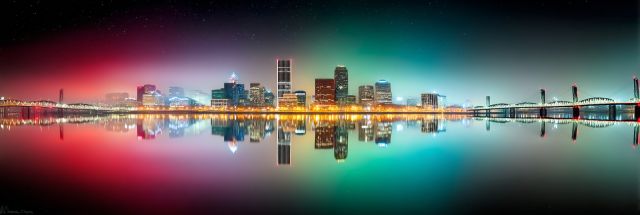 Beneath a dusky panorama, the spellbinding skyline of Portland emerges as a radiant mirage, reflecting off the calm waters like a scene conjured from a celestial painter's palette. As dusk settles into night, the city's angular silhouettes are softened by a kaleidoscope of colors, lending an air of mystique and fantasy reminiscent of the Burning Man Festival’s free-spirited artistic expressions. Soft hues of cobalt, magenta, and fiery orange intermingle across the sky and are mirrored into infinity below, creating an almost surreal, double-visaged cityscape. The artful fusion of natural splendor with human ingenuity crafts a tranquil yet electrifying tableau, perfect for igniting imaginations and inspiring peace. Just as jellyfish float effortlessly through the sea, the lights of Portland’s skyline seem to drift across the canvas with an elegant ease, anchored only by the dark silhouettes of the soaring buildings and the iconic bridges that span the reflective waters. The merging of these elements creates a perfect harmonization of serenity and vibrance, making it an idyllic subject for one to marvel at the continuity between sky, earth, and water.