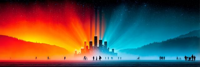 Enveloped in a kaleidoscope of vibrant hues, the Miami skyline emerges as a radiant spectacle against the dusk's embrace. This artwork transcends the everyday, capturing the dynamic essence of the city infused with the celebratory spirit of the Burning Man festival. Each building, bathed in a symphony of fire-like reds and cool blues, pierces the horizon with beams of light that stretch upward as if in communion with the stars. The foreground is animated with silhouettes of festival-goers, their movements a silent dance on the canvas of twilight. The contrasting temperatures of color and light invite the viewer into a realm where urbanity and fantasy converge. Through meticulous strokes, the artist encapsulates not just a place, but a moment teeming with life, energy, and the palpable buzz of human connections forged under the spell of communal celebration.