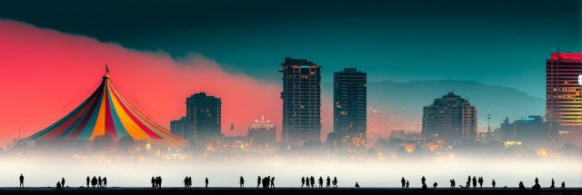 As the evening folds into the velvet night, the horizon of San Jose is transformed into a pulsating carnival of lights and shadows, reminiscent of the spirited ambiance of the Burning Man festival. This mesmerizing canvas paints the city’s architecture, alive with vibrant hues of amber, crimson, and cobalt that pierce through a misty haze enveloping the skyline. The infamous technicolor tent, an iconic symbol often associated with the eclectic festival culture, dominates the foreground as a beacon of creativity and communal celebration. Silhouetted figures traverse the expansive frontal plane, their outlines casting long shadows that dance mysteriously with the fog-swirled ground, adding a layer of intrigue and humanity to the city’s impersonal structures. The skyscrapers, each glowing like embers in the growing dusk, stand as monoliths of modern aspirations, softened by the surreal, dream-like quality of the atmosphere. This canvas is not merely a visual experience; it is an invitation to ponder the convergence of everyday urban life with the extraordinary, fleeting moments of festivity that ignite a collective spirit of adventure and freedom.