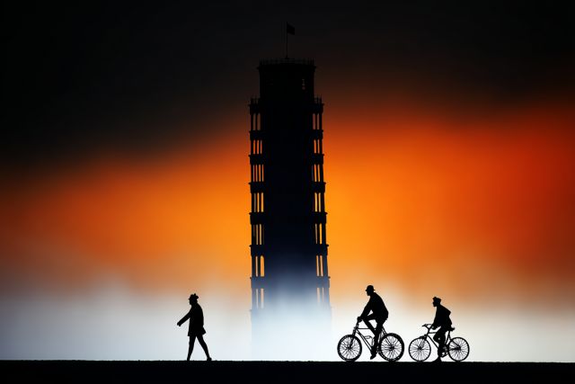 As dusk pulls its velvety shroud over the horizon, the world transforms into a stage of intriguing silhouettes and electrifying colors. In this stunning visual artwork, the serene ballet of everyday life is juxtaposed against the majestic backdrop of an imposing tower that pierces the sky. A lone pedestrian, immersed in contemplation, walks the path of solitude, while cyclists glide by, merging their rhythmic motion with the gentle evening breeze. Each figure is etched sharply against a fiery sky that bleeds oranges and yellows into tranquil blues—a canvas that speaks simultaneously of the day’s fiery end and the night's calm onset. This artwork not only captures a moment but narrates a dance of shadows and light, where each silhouette tells its own silent story against the grandeur of the architectural marvel. It’s an evocative reminder of the quiet grace found in daily life, dramatized by the powerful presence of the tower standing sentinel over fleeting moments.