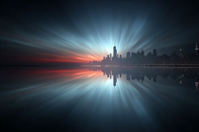 The artwork invites viewers into a fantastical portrayal of an iconic city skyline, bathed in the ethereal glow of a sunrise that fanfares the break of day. The horizon bends softly as whispers of daylight stretch across a mirrored water surface, turning the calm lake into a canvas of vibrant hues and shimmering lights. In this scene, the familiar contours of high-rises and landmarks gain new mysticism, being silhouetted against an expansive sky that blooms from deep blues into mesmerizing gradients of red and orange. This surrealistic representation takes one beyond mere observation, offering a moment of contemplation as ethereal rays pierce the heavens, painting each building with sharp, almost divine beams of light. While the city itself is obscured in the delicate dance of shadow and light, its essence is heightened, evoking a sense of infinite possibility and silent reverence for the day’s fledgling moments. The dual reality, where sky and water meld, serves as a testament to the nuances of reflection—both literal and metaphorical—as the scene invites onlookers to ponder their reflections amidst the realms of such urban majesty.