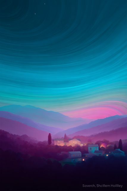 As dusk settles over a tranquil village, the sky above unfurls in a breathtaking tapestry of colors. This canvas captures an ethereal moment when the veil of night begins to cloak the day, and nature performs its quiet symphony. The village, nestled among gentle hills, exudes a dreamlike quality under the watchful gaze of the stars peeking through the swirling celestial dance. In the foreground, soft lights from cozy homes offer a glimpse of life's simplicity and warmth. The artwork paints the village in a surreal light, where pastel blues, vibrant pinks, and soothing purples converge in harmony, evoking a sense of peace and nostalgia. This scene invites the viewer to breathe in the crisp evening air and cherish a moment of sublime stillness, away from the bustling world. Each brushstroke emphasizes the unique interplay between light and shadow, drawing the eye to explore every corner of this picturesque landscape. The church steeple, a subtle but poignant detail, pierces the horizon, grounding the composition and guiding the viewer's journey through the canvas. This piece is not merely a visual delight but a portal to introspection and tranquility, suggesting stories untold and melodies unheard in the softness of a village night.