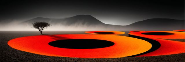 Amidst the vast and whispering landscapes of Namibia, a breathtaking scene unfolds, as if pulled from the realms of the fantastical. Known as Fairy Circles, these enigmatic patterns in the arid grasslands are a spectacle of nature’s mystique, presented here in the fiery shades reminiscent of the energetic ambiance of the Burning Man Festival. In this image, the circles emerge with a vibrancy that contrasts starkly against the subtle hues of a fog-laden background, where a solitary tree stands as a silent sentinel. The stark black centers of these circles, bordered by brilliant reds and encircled by the soft browns of the earth, create a visual rhythm that echoes the untold tales of ecological phenomena and spiritual lore tied to this landscape. The subdued mountains in the distance further envelop the scene in an aura of mystery and grandeur, inviting viewers to lose themselves in contemplation and awe. This portrayal not only captures the visual beauty of these fairy circles but also evokes a deeper wonder at their formation, attributed by scientists to the interplay of natural competition and cooperation among organisms, though local legends speak of gods and spirits. As the hues transition across the canvas, so does the emotion, ranging from intense passion to serene melancholy, encapsulating the drama and tranquility of nature itself.