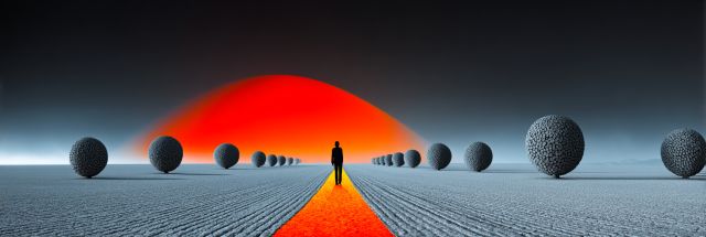 A breathtaking visual odyssey unfolds in an expanse of monochrome tranquility, where the crisp horizon marries a fiery celestial orb at the break of an ethereal dawn. In this visionary tableau, perfectly spherical forms—the texture of brain coral—line a path that stretches into the infinity of an enigmatic and stark landscape. Each sphere stands as a silent sentinel, witnessing the transient passage of a lone figure who walks resolutely toward the glowing orb that bathes the scenery in an arresting, otherworldly vermilion. The contrast between the inky blue of the endless sky and the rich, radiant red evokes a profound sense of cosmic duality—light against dark, calm against fervor. This spectacle, reminiscent of a celestial alignment or a distant planet's sunrise, invites viewers on a meditative journey where one contemplates the mysteries held within the universe and within themselves. The image is suffused with a sense of isolation yet imbued with hope, as the lone silhouette progresses towards illumination, perhaps symbolic of personal or spiritual awakening. Here, art not only imitates life but transcends it, urging one to ponder over nature's magnitudes and the human soul's place within it.