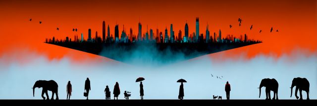 "Ethereal Cityscape: A Surreal Blend of Urban Silhouettes and Wilderness"