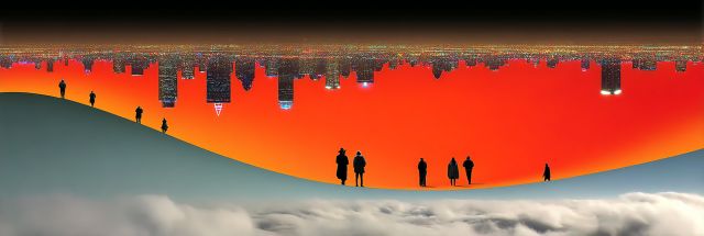 In an extraordinary convergence of reality and imagination, the Mesa Skyline unfolds under the vivid hues of a burning sky, reminiscent of the electrifying atmosphere at a festival akin to Burning Man. The horizon erupts in a fiery orange, casting a warm glow that seems to set the skyline ablaze with life and energy. Below, a surreal, misty foreground serves as a stark contrast, where silhouettes of observers stand in quiet contemplation. This dynamic balance of warmth above and the cool, dreamlike mist below creates a captivating visual narrative. The cityscape, dotted with lights and vibrant festive banners, stretches endlessly, inviting the viewer into a world where urban life meets wild celebration. As the eye travels across this panoramic vista, it encounters a series of dynamic interactions between light, shadow, and color, each element meticulously contributing to a tapestry of urban vibrancy enveloped in mystic tranquility. This artwork not only captures the essence of a city alive with cultural festivity but also evokes a profound sense of being part of something larger than life, where every moment is a spectacle and every spectacle is a moment to be revered.