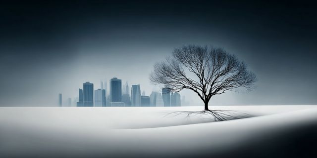 In an evocative interplay of nature and urbanity, a solitary tree stands poignantly against the distant silhouette of New York City's famous skyline. The tree, bare of leaves, spreads its intricate branches against a stark, wintry backdrop, encapsulating a moment of profound stillness and simplicity. This composition masterfully contrasts the organic lines of the natural world with the sharp, geometric forms of human construction, inviting viewers to contemplate the coexistence of these two realms. The snow-covered ground amplifies the scene's tranquility, its unblemished whiteness forming a perfect canvas that highlights the tree's delicate, shadowy fingers. Above this serene landscape, the sky transitions subtly from a gentle grey to a deeper, contemplative blue, suggesting the approach of dusk or the retreat of dawn. This piece is not just a visual fare but a narrative of resilience, standing as a metaphor for solitude and steadfastness in the face of the sprawling urban growth. Engaging and deeply moving, this artwork captures the poignant beauty and stark contrasts that define our modern existence.
