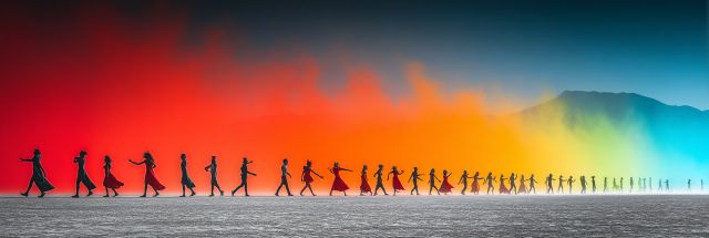 Under an uninterrupted cascade of vivacious hues, a procession of silhouettes illustrates the human joy and connection found at a celebratory gathering reminiscent of the Burning Man festival. This striking image captures a series of figures, each uniquely poised, as they move rhythmically across an expansive landscape that bridges the tangible and the imagined. The stark contrast between the dark figures and the luminously painted sky evokes a sense of freedom and endless possibility. As the colors transition smoothly from deep reds to vibrant yellows and calming blues, this portrayal not only reflects the physical movements of the dancers but also mirrors the emotional spectrum experienced by attendees of such transformative events. The background, blurred yet brightly colored, suggests a place where reality softens and dreams take shape, where community and individual expression dance hand in hand. This artwork invites the viewer to reflect on the potent mix of solitude and solidarity that festivals often inspire, encapsulating a moment of unity where differences dissolve into the all-encompassing hues of celebration. Its essence is not just in capturing an event but in evoking the transcendent human experiences that such gatherings can offer—where every step and gesture becomes a stroke on the vast canvas of human experience.