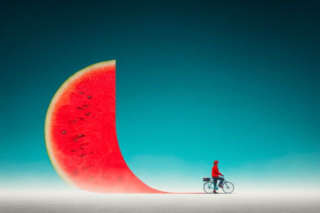 Imagine a world where the ordinary transforms into the extraordinary—a place where your everyday road twists into a vibrant slice of watermelon, its rich red flesh sprawling ahead. This artwork captures a surreal journey of a lone cyclist, dressed in a striking red jacket, cruising along this fantastical path under a serene, azure sky. The setting is minimal yet profoundly striking, emphasizing the contrast between the mundane and the magical. The vast emptiness surrounding the road highlights the uniqueness of the traveler's path, turning an ordinary ride into an exploration of wonders unseen and territories uncharted. The watermelon road, with its juicy texture and scattered seeds, adds a playful and whimsical touch to the canvas, inviting viewers to ponder the possibilities of imaginative escapes in their daily lives. This piece isn't just art; it's a vibrant invitation to break free from the routine and to savor the flavors of creativity and fantasy that lie hidden in the corners of our minds.