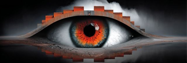 Delve into a surreal juxtaposition where the vast beauty of the Sahara intertwines mysteriously with the architectural elegance of urban skylines. Captured within the iris of an evocatively detailed eye, the dichotomy of natural wonder and human ingenuity unfolds. This artwork invites viewers on a visual journey across disparate realms. The fiery orange and deep red hues encircling the pupil burn with the intensity of a desert sun, while the cool greys and structural outlines within project a stark, organized calm reminiscent of city life. The horizon is skillfully melded with the lower eyelid, creating a seamless yet disquieting boundary between the gritty reality and the vivid allure of imagination. This piece is not only a celebration of contrasting landscapes but also a commentary on the human vision that shapes and perceives our world, encouraging a reflection on how we view our environments and the interconnectedness of seemingly disparate elements.