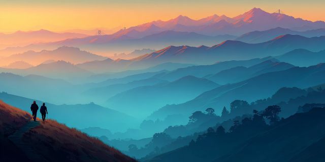 As the day surrenders to the enchantment of twilight, the world transforms under a vast expansive canvas painted with dusky hues and subtle whispers of nightfall. In the gentle embrace of the evening, two silhouetted figures emerge, their forms outlined against the delicate gradients that cloak distant mountains. These wanderers, tiny yet bold, conquer the serpentine trails of the foreground hills, each step a testament to the allure of the natural world interplaying with human endeavor. Beyond the rolling, multi-layered ridges that cascade rhythmically into each other, the iconic San Francisco skyline pierces the heavens, its skyline a jagged heartbeat against the softer lines of nature. This striking juxtaposition invites viewers to ponder the delicate balance between urban expansion and natural beauty. The confluence of earthy tones and geometric abstraction enhances this artwork, making it not just a visual treat but a narrative of resilience and exploration.