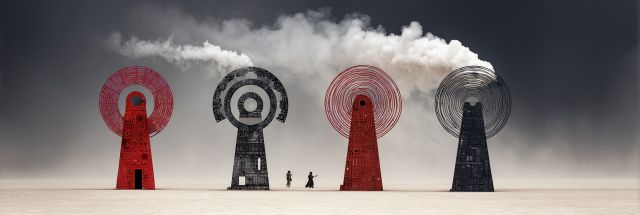 Imagine wandering through an ethereal landscape where the boundaries between art and experience blur, crafting the surreal tableau of infinite geometries and vibrant contrasts. This canvas captures such a scene, reminiscent of the monumental installations at the Burning Man festival. It features three colossal sculptures, standing as beacons in an expansive desert. Their forms twist upwards, wrought in spiraling patterns that play with the eye, introducing a mesmerizing motion against the starkness of their surroundings. Each sculpture, painted in hues of burning red to deep gray, exhales clouds of white smoke, contributing to the mystical atmosphere. Tiny human figures stand in awe, offering a sense of scale and the humbling power of human creativity in juxtaposing nature's vast canvas. This artwork isn't just a visual spectacle; it's a journey into the depths of human ingenuity and the primal allure of mythical structures, evoking a world where time stands still and every glance holds a story.