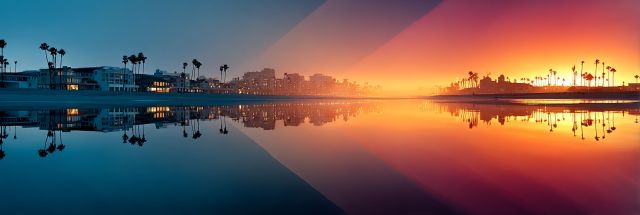 As twilight merges with the vibrancy of a Fourth of July fireworks display, the Huntington Beach skyline bathes in a mesmerizing contrast of cool blues and fiery oranges. This stunning canvas masterfully captures the golden glow casting over serene waters, where the reflections of palm trees and elegant high-rise buildings paint a double vision of beauty. The left side of the canvas, draped in a tranquil blue, invokes the calm sophistication of the beach at dusk, suggesting the rhythmic whisper of ocean waves. To the right, the canvas explodes in bursts of orange and red, mirroring the passionate bursts of fireworks that light up the Independence Day sky. This artwork not only showcases the technical prowess of high-definition textures and natural lighting but also encapsulates a moment of national pride and celebration. It is a narrative of contrast and harmony; a dance of shadows and light where science fiction and surrealism playfully intertwine to elevate a traditional cityscape into an extraordinary artistic expression. Beyond just a visual treat, this piece invites observers to delve into the depths of its creativity, pondering the juxtaposition of calm and chaos that mirrors our own lives.