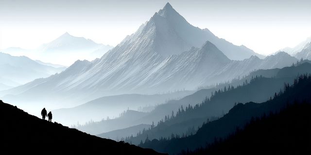 In the tranquil expanse of a mountainous dreamscape, two hikers are captured in silhouette, dwarfed by the majestic peaks that tower above them. The composition leads one into a world of muted earth tones and delicate shades, where light and shadow play endlessly across mist-covered ridges. The stark, geometric lines of the mountains carve into the sky, creating a stark contrast to the soft, enveloping fog that blankets the valleys. Here, the air hums with the silent music of nature, a symphony of wind whispering through ancient pines and distant birdcalls. Each step upon the rugged terrain is a quiet testament to the resilience of the human spirit, a delicate dance between the awe of nature’s grandeur and the intimate presence of human endeavor. As the journey unfolds, the canvas becomes a space of contemplation and serenity, inviting the viewer to lose themselves in the vastness, to breathe in the crisp mountain air and feel the weight of the world dissolve into the ether.